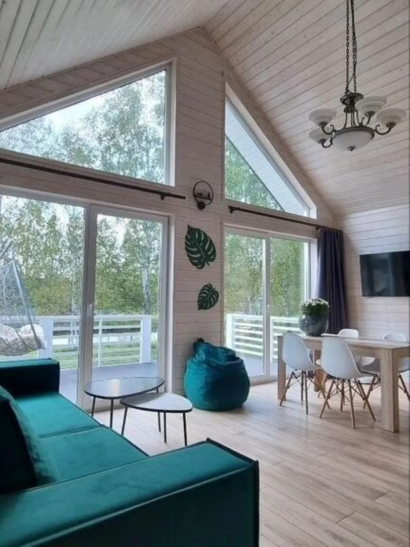 Из больших панорамных окон домика открывается шикарный вид на пруд размером 15 соток, в котором есть возможность купаться, есть лежаки и пирс, при желании можно ловить рыбу. В доме есть всё для комфортного проживания 6 человек.